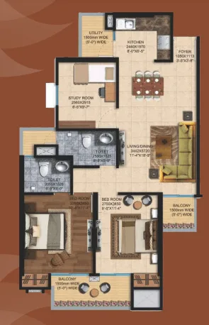 Living | Dining | 2 Bedrooms | 2 Toilets | Kitchen | 3 Balconies | Study