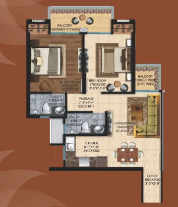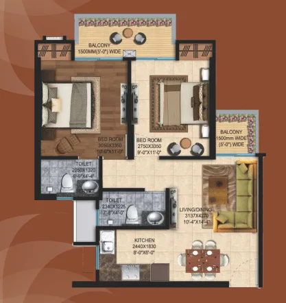 Living | Dining | 2 Bedrooms | 2 Toilets | Kitchen | 2 Balconies