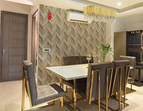 Mdr Bed: Engineered Wooden Flooring, Plastic Paint on FOP Plaster with Texture paint behind bed, Oil Bound Distemper on FOP Plaster/Pufty, Built-in Wardrobe: Stationery Designer Shutters in Dressing Area, Copper concealed wiring in PVC Conduit: Premium Range Modular Switches, Internal Designer Flush Door-shutters with optional light used frame-sheet height, Premium Target Energy Effectors (Built AC and General Lighting Filters).