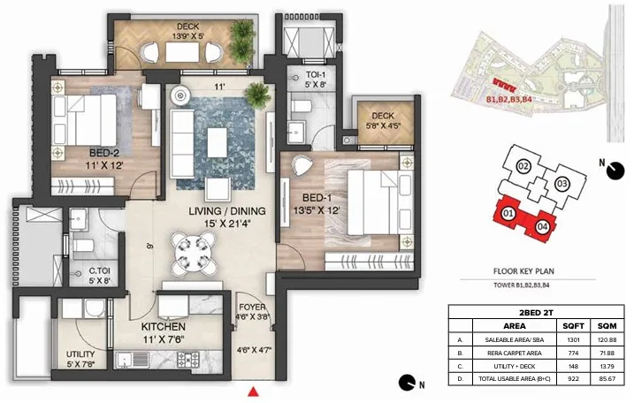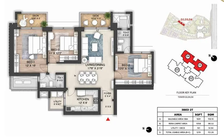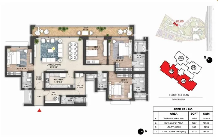 Featuring 23 towers rising from G+41 to G+50 floors, the project comprises approximately 4,000 premium residential units, with just 4 units per floor to ensure privacy and space. The township offers thoughtfully designed 2, 3, and 4 BHK apartments, duplexes, and penthouses, ranging from 1,301 sq. ft. to 6,026 sq. ft. Currently, large-size 3 and 4 BHK units are available for sale, ranging from 2,236 to 6,026 sq. ft.