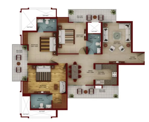 This IGBC Gold-certified project emphasizes sustainability and durability through innovative construction technologies. Mivan shuttering, a fast-paced technique using aluminum formworks, ensures superior strength and durability for the buildings. High-quality materials like Tata Steel and Jindal Steel are used for RCC load-bearing structures, while UPVC doors and windows feature three-track frames with mosquito nets and toughened glass. The main entrance doors are designed with wooden frames and flush doors with a 2400 mm opening.
